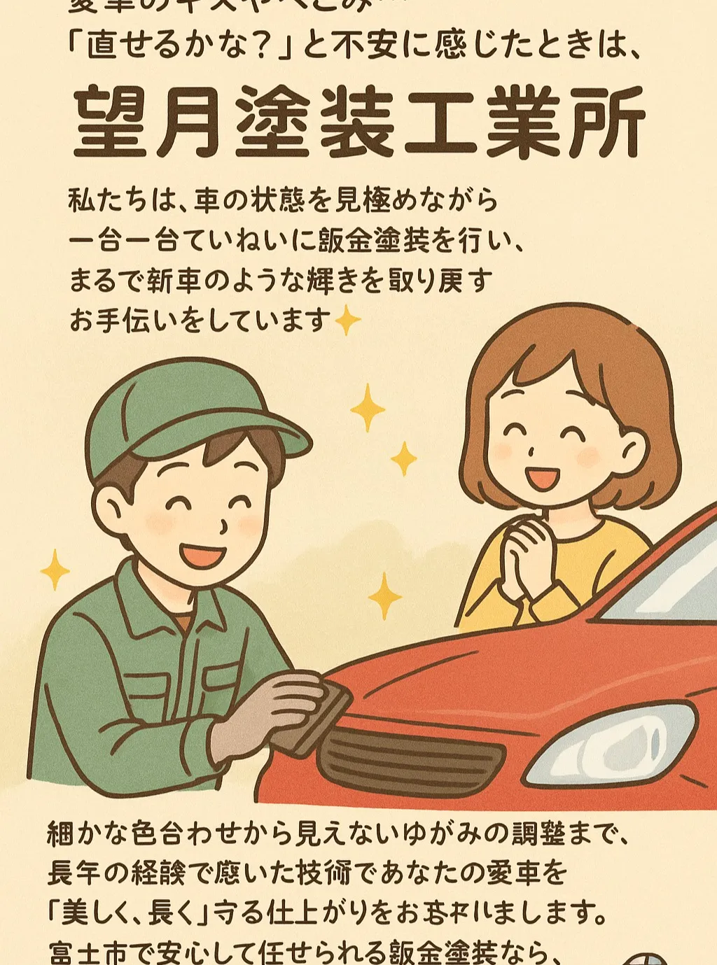 🚗✨ 愛車の小さなキズやへこみ、気になりませんか? 望月塗装工業所にお任せください!私たちは一台一台、心を込めて丁寧に仕上げます。鈑金から塗装まで、まるで新車のような仕上がりで、あなたの愛車を輝かせます。細かな色合わせや、見えづらい部分の調整までしっかりと対応し、「また乗るのが楽しみになる」そんな魅力をお届けします。富士市で信頼できる車体整備をお探しなら、望月塗装工業所へぜひご相談ください😊✨愛車と共に過ごす日々が、もっと楽しくなる瞬間をお手伝いします。お客様の笑顔を何よりも大切に、安全で安心できるサービスを提供し続けます。お気軽にお問い合わせください。
