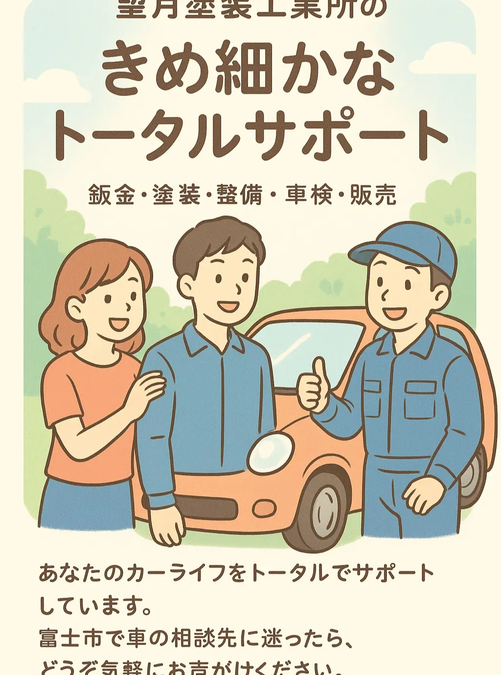 一台一台の車を"家族のように"大切にし、心を込めた丁寧で透明なサービスを提供しています。富士市で車の相談先に迷った方、ぜひとも私たちにお声がけください。あなたの愛車を、いつまでも美しく、安心して乗り続けられるようにお手伝いいたします🌟